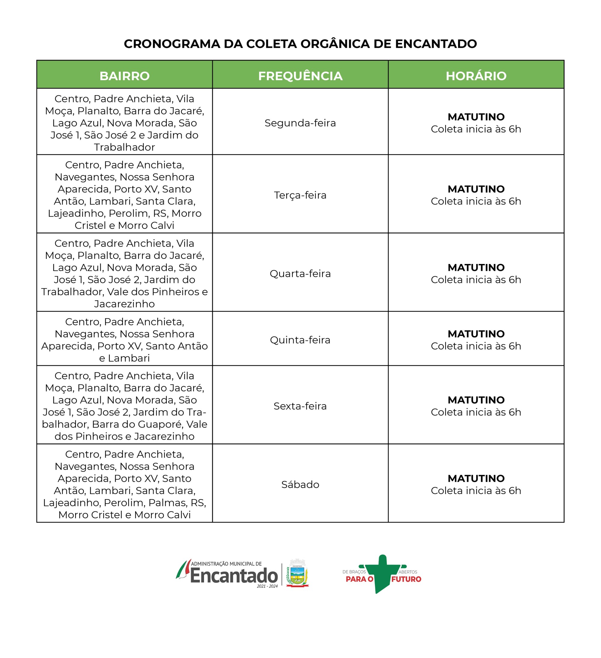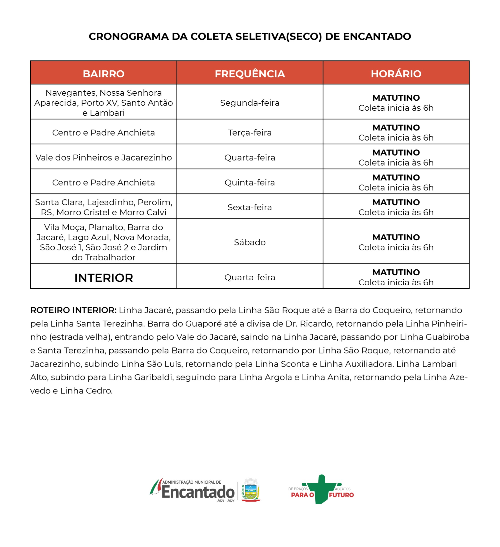 Nesta semana chegaram os três caminhões novos que serão utilizados para o recolhimento na cidade e no interior, conforme estabelecido pelo roteiro. O trabalho será realizado de segunda a sábado, sempre a partir das 6h (veja roteiro abaixo).